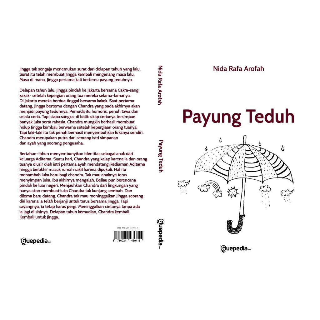 Payung Teduh PENULIS: Nida Rafa ArofahISBN: 978-602-443-941-5Penerbit : Guepedia PublisherUkuran : 14 x 21 cmTebal : 132 halamanHarga: Rp70.000Sinopsis:Jingga tak sengaja menemukan surat dari delapan tahun yang lalu. Surat itu telah membuat Jingga kembali mengenang masa lalu. Masa di mana, Jingga pertama kali bertemu payung teduhnya. Delapan tahun lalu, Jingga pindah ke Jakarta bersama Cakra-sang kakak- setelah kepergian orang tua mereka selama-lamanya. Di Jakarta mereka berdua tinggal bersama kakek. Saat pertama datang, Jingga bertemu dengan Chandra yang pada akhirnya akan menjadi payung teduhnya. Pemuda itu humoris, penuh tawa dan selalu ceria. Tapi siapa sangka, di balik sikap cerianya tersimpan banyak luka serta rahasia. Chandra mungkin berhasil membuat hidup Jingga kembali berwarna setelah kepergiaan orang tuanya. Tapi laki-laki itu tak penah berhasil menyembuhkan lukanya sendiri. Chandra selalu bersembunyi. Membiarkan luka itu hadir tanpa diobati. Chandra merupakan putra dari seorang istri simpanan dan ayah yang seorang pengusaha. Bertahun-tahun menyembunyikan identitas sebagai anak dari keluarga Aditama. Istri pertama ayah pada akhirnya tau juga dan berusaha keras menjauhkan Chandra dengan ayahnya. Suatu hari, Chandra yang kalap karena ia dan orang tuanya diusir oleh istri pertama ayah mendatangi kediaman Aditama hingga berakhir masuk rumah sakit karena dipukuli. Hal itu menambah luka baru bagi chandra. Tak mau anaknya terus menyimpan luka. Ibu akhirnya mengalah. Beliau pun berencana pindah ke luar negeri. Menjauhkan Chandra dari lingkungan yang hanya akan membuat luka Chandra tak kunjung sembuh. Dan dilema baru datang. Chandra tak mau meninggalkan Jingga seorang diri karena ia telah berjanji untuk terus bersama Jingga. Tapi sayangnya, ia tetap harus pergi. Meninggalkan cintanya tanpa ada ia lagi di sisinya. Delapan tahun kemudian, Chandra kembali. Kembali untuk Jingga. Dan hidup bersama gadis itu seperti apa yang ia janjikan.Happy shopping & readingEnjoy your day,